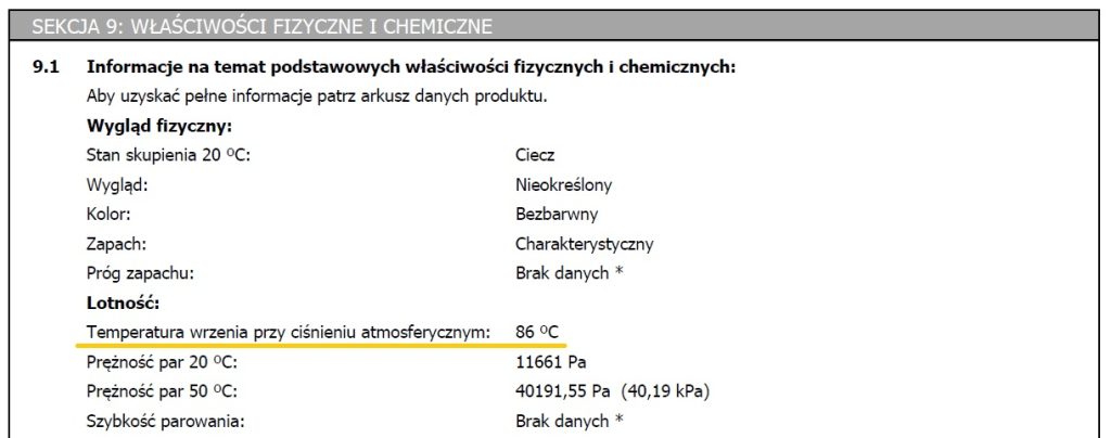 Temperatura wrzenia danej substancji powinna być określona uznaną metodą. Najczęściej wystarczy odczytać wartość z karty charakterystyki substancji. Właściwości tego typu odczytujemy z sekcji 9.