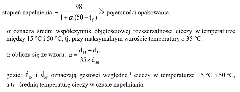 Jeżeli przepisy odnoszące się do konkretnej klasy nie stanowią inaczej, to maksymalny stopień napełnienia opakowań w temperaturze 15 °C powinien być określony następująco: